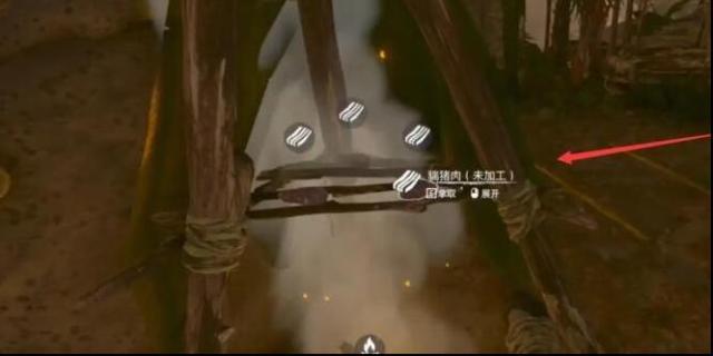 1、玩家進(jìn)入游戲中,來(lái)到竹制熏肉架旁邊,如圖所示。